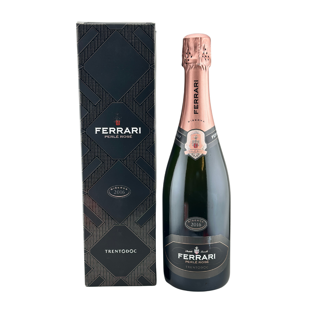 Ferrari Perlé Rosé Riserva 2016 – elegante Trentodoc Metodo Classico firmato Fratelli Lunelli, ottenuto da Pinot Nero (80%) e Chardonnay (20%) coltivati in vigneti di alta collina in Trentino. Affinamento di oltre 50–60 mesi sui lieviti che dona struttura e complessità. Colore rosa antico, perlage fine e persistente. Profumi intensi di fragoline di bosco, lampone, ribes, rosa, scorza d’arancia e crosta di pane. Gusto elegante, vellutato e armonico, con note speziate e finale lungo.