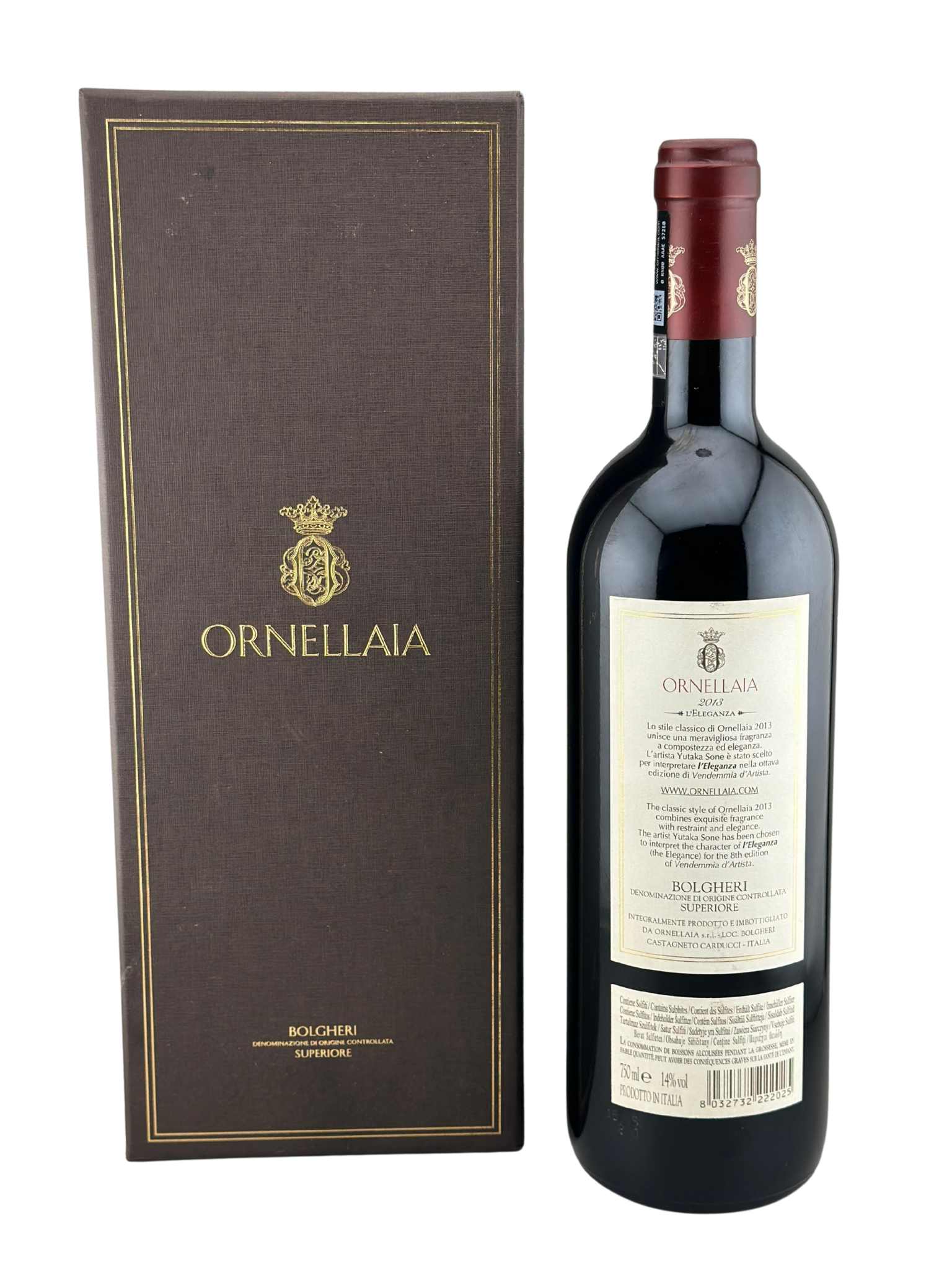 Ornellaia L’Eleganza 2013 è un vino da collezione e da investimento, edizione speciale celebrativa della celebre Tenuta dell’Ornellaia. L’annata 2013, fresca e di grande equilibrio, ha dato origine a un vino raffinato, complesso e armonico, che unisce potenza ed eleganza con una straordinaria capacità di invecchiamento. Questa edizione limitata, molto ricercata dai collezionisti, rappresenta una delle massime espressioni dei Supertuscan di Bolgheri.
